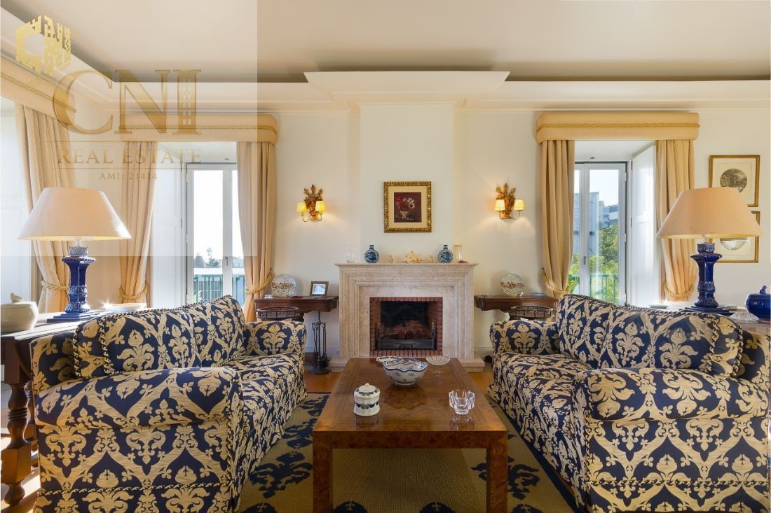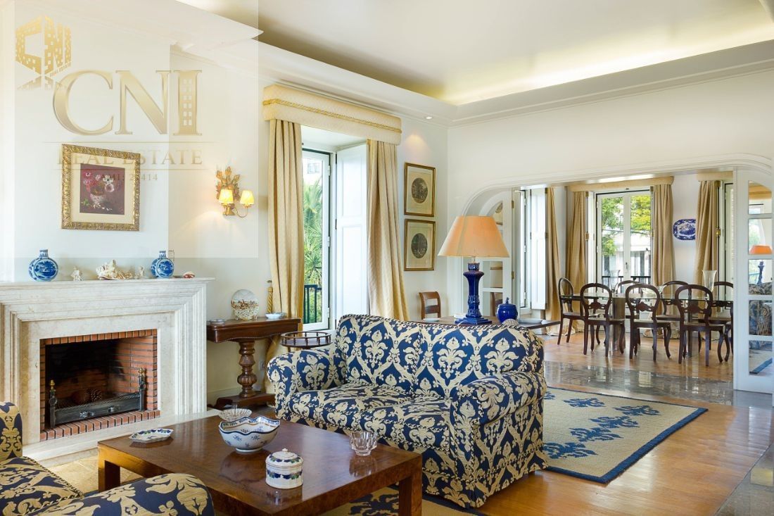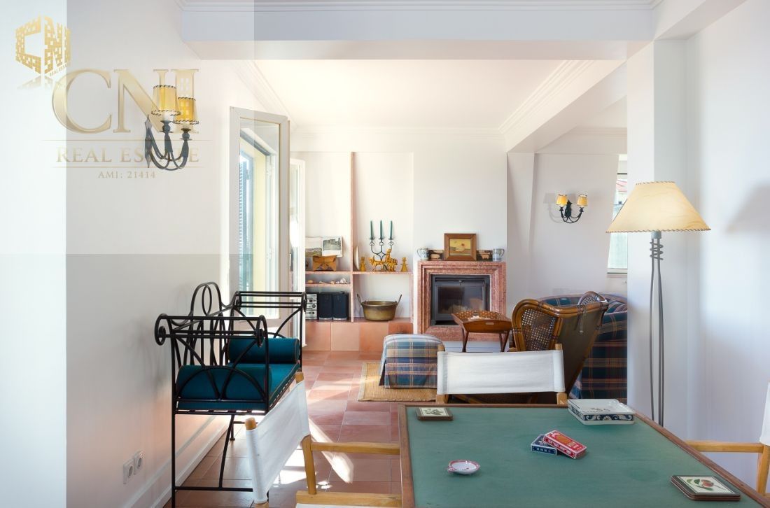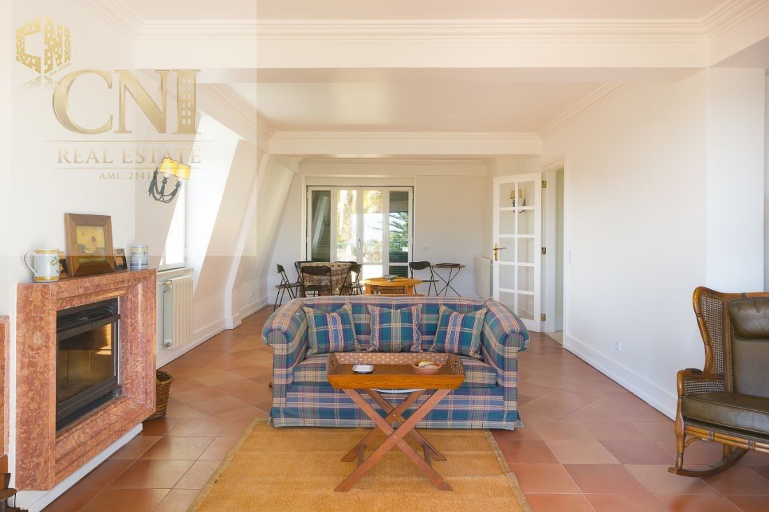 Sala de estar com lareira (com duas/três zonas distintas) - 42 m2 + varanda de 11 m2 com vista mar de 180 º (do farol do Bugio a Cascais)