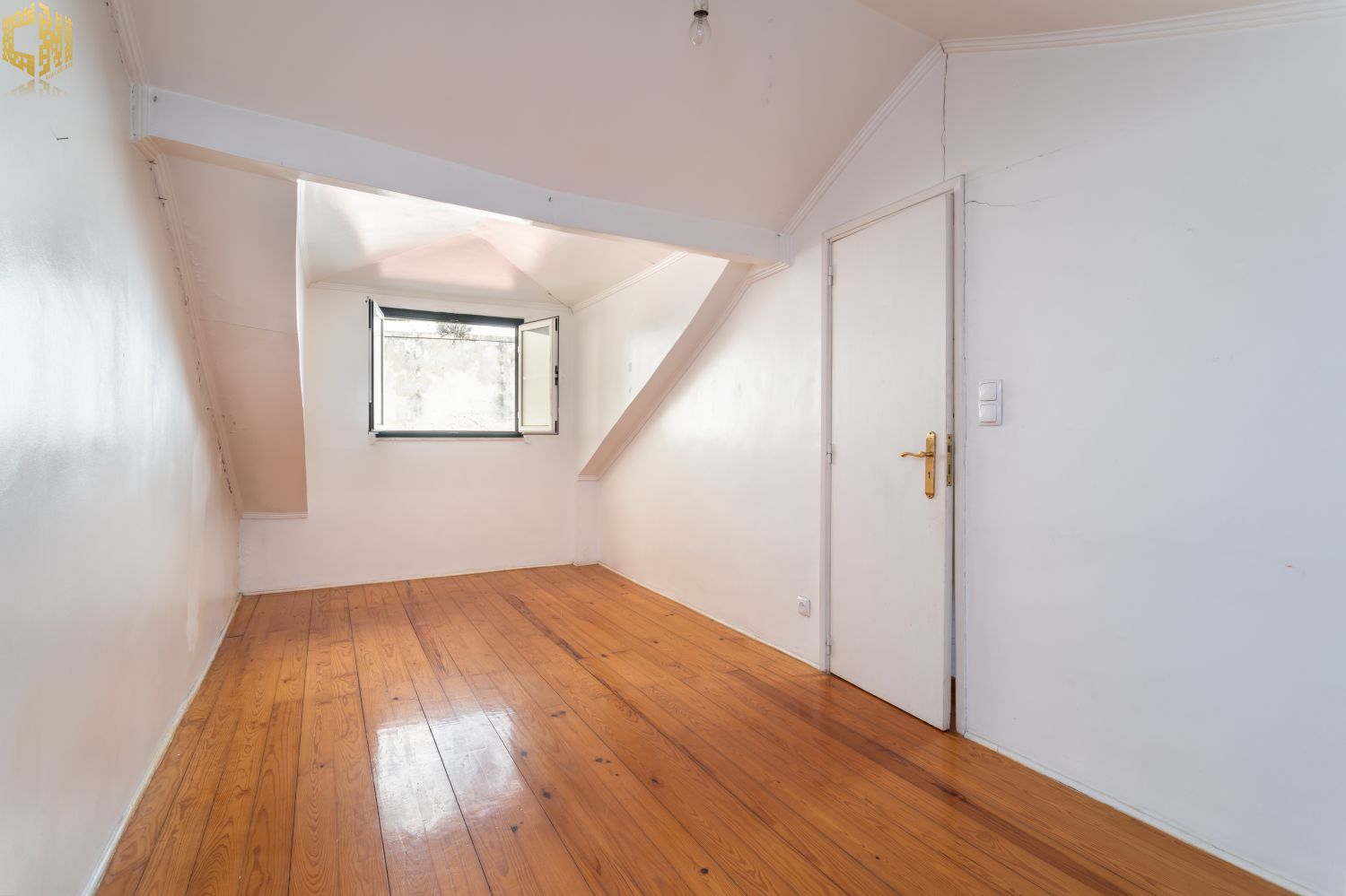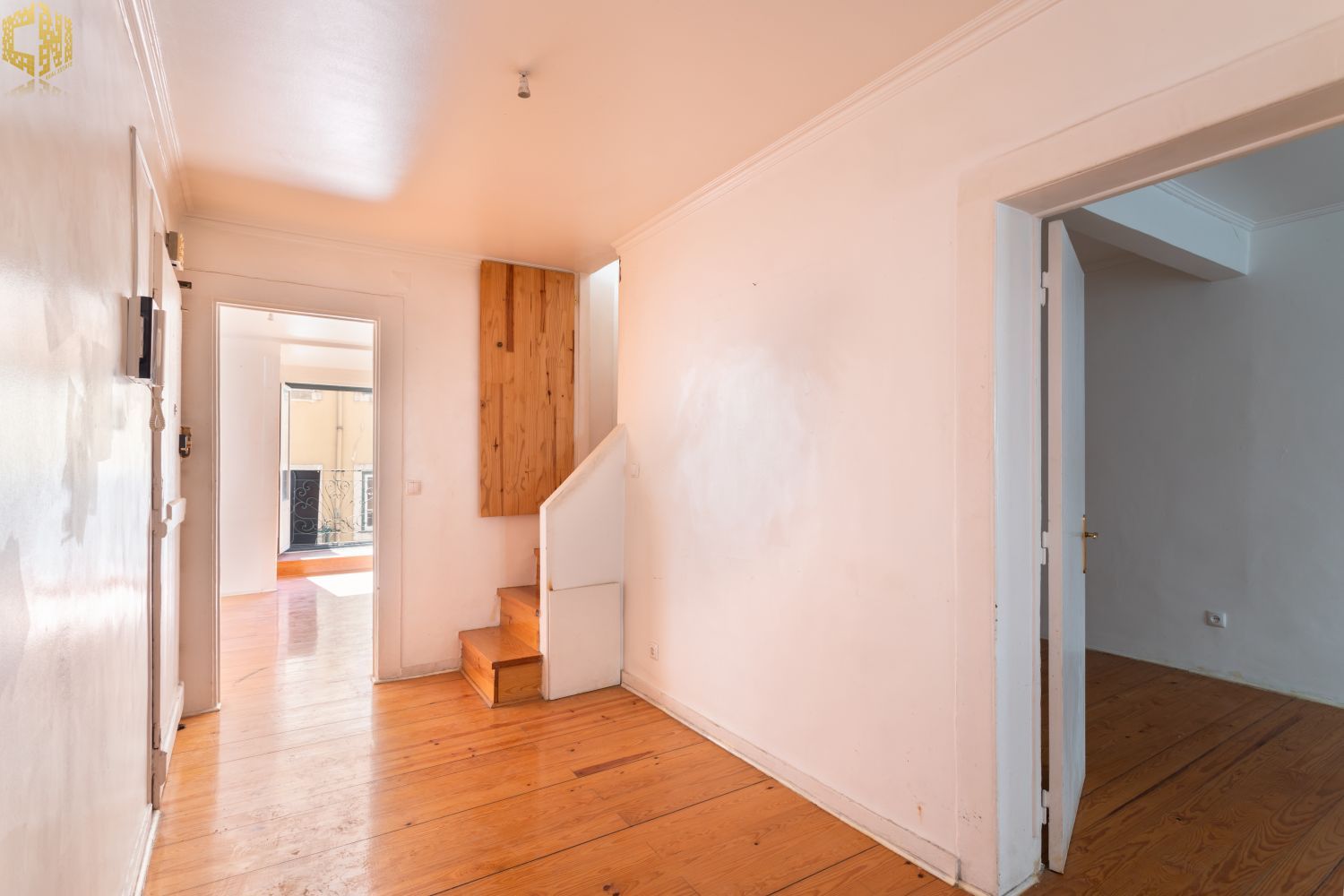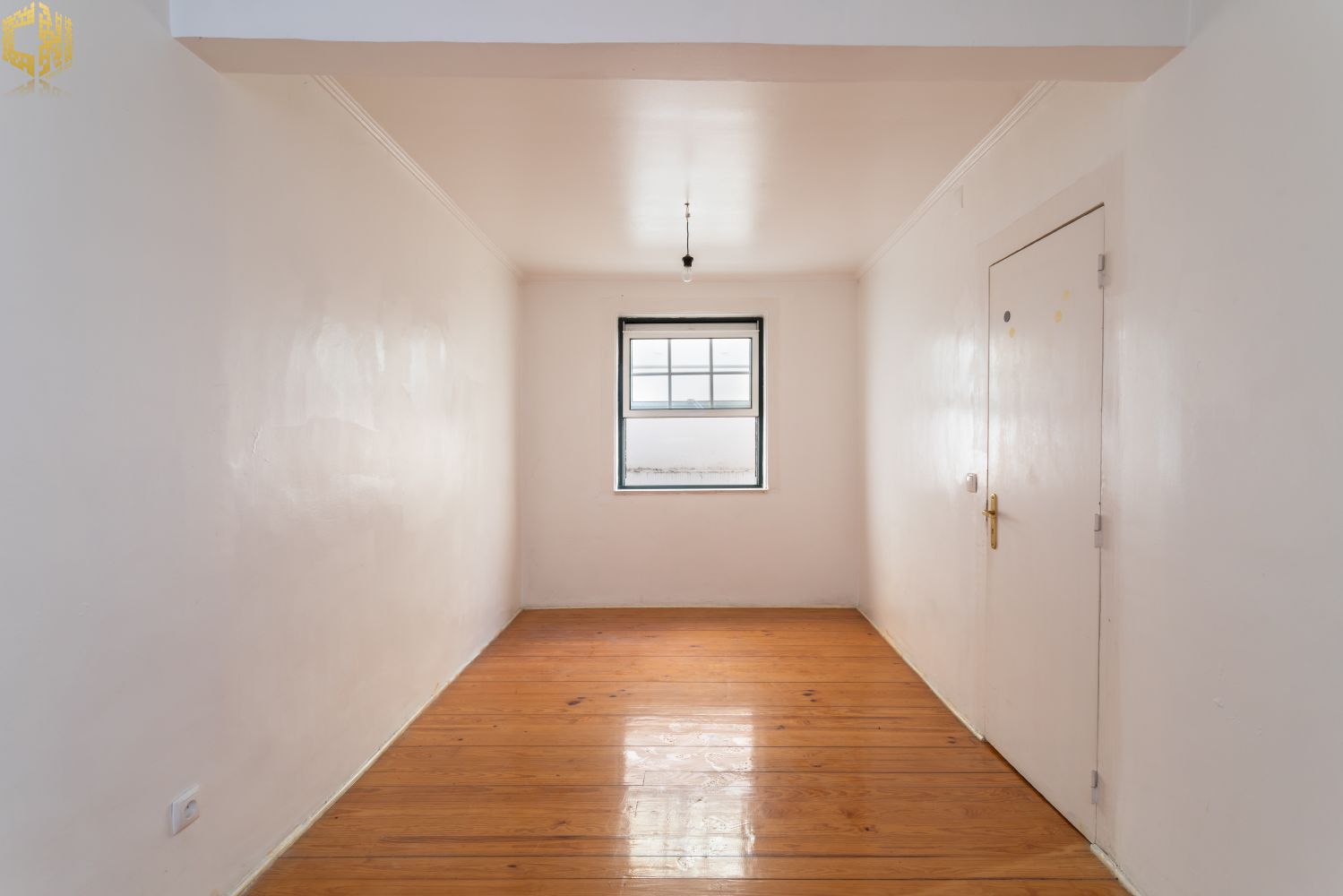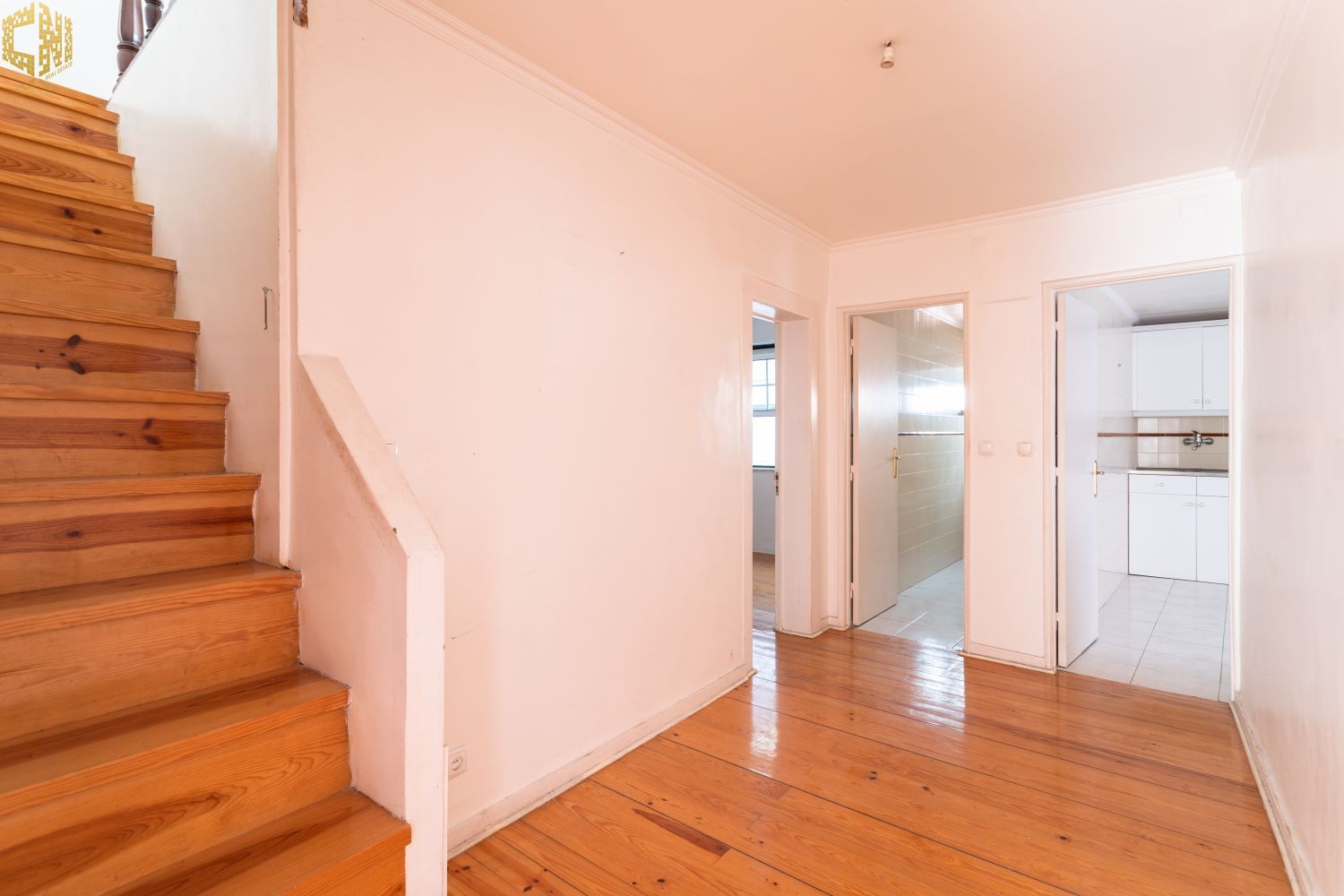 No piso térreo  sala com chão de madeira, dois quartos – um dos quais interior – cozinha, e casa de banho com janela.