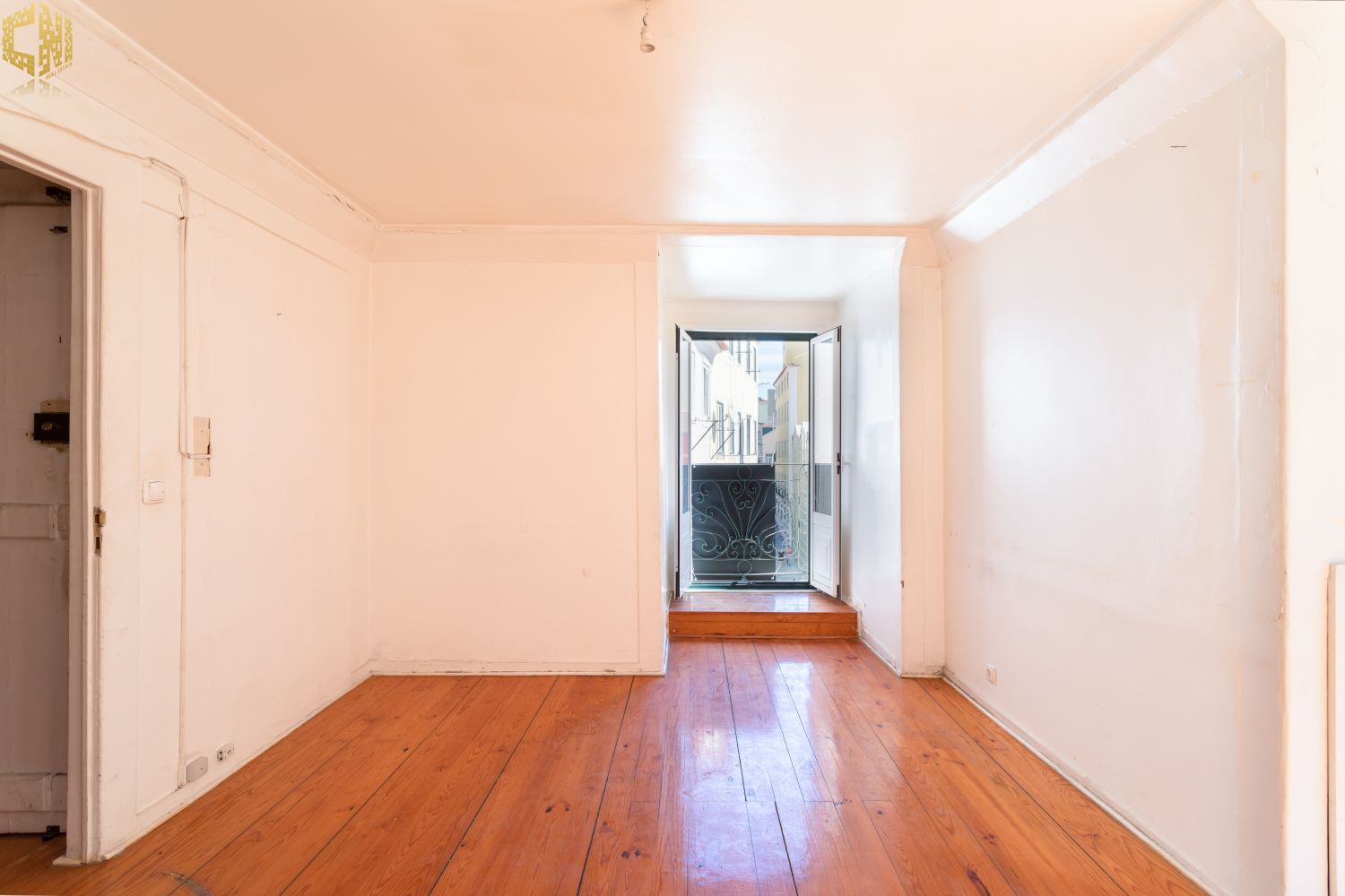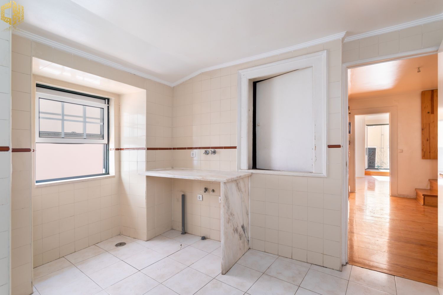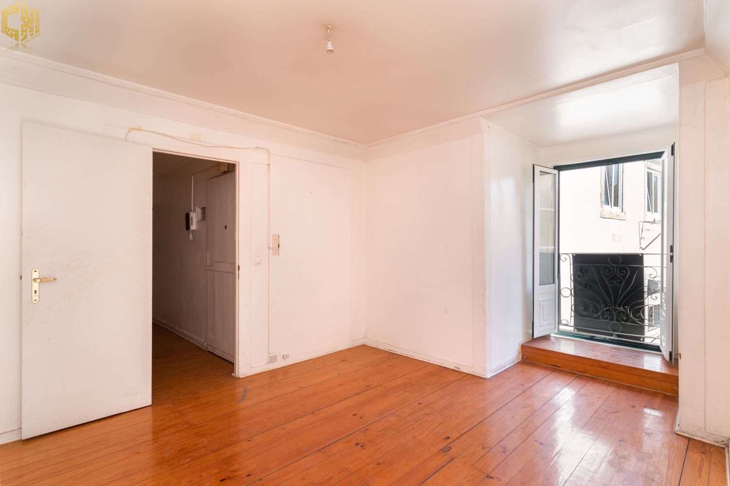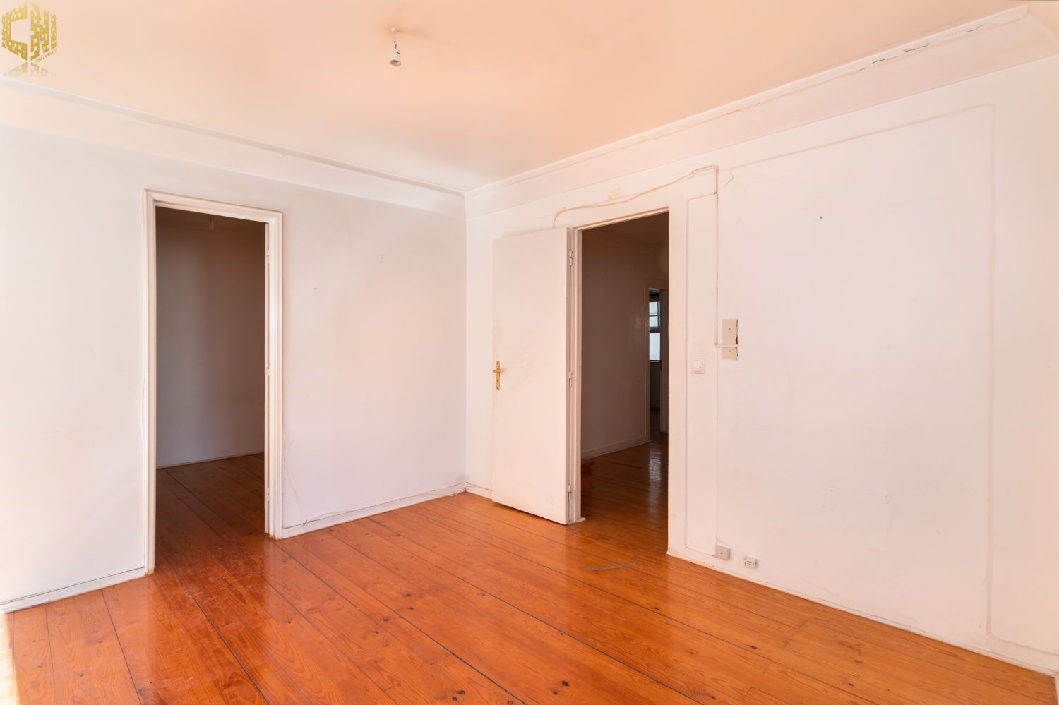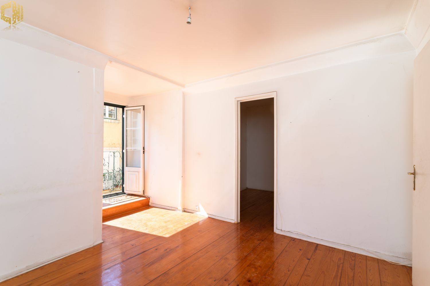 No piso térreo  sala com chão de madeira, dois quartos – um dos quais interior – cozinha, e casa de banho com janela.