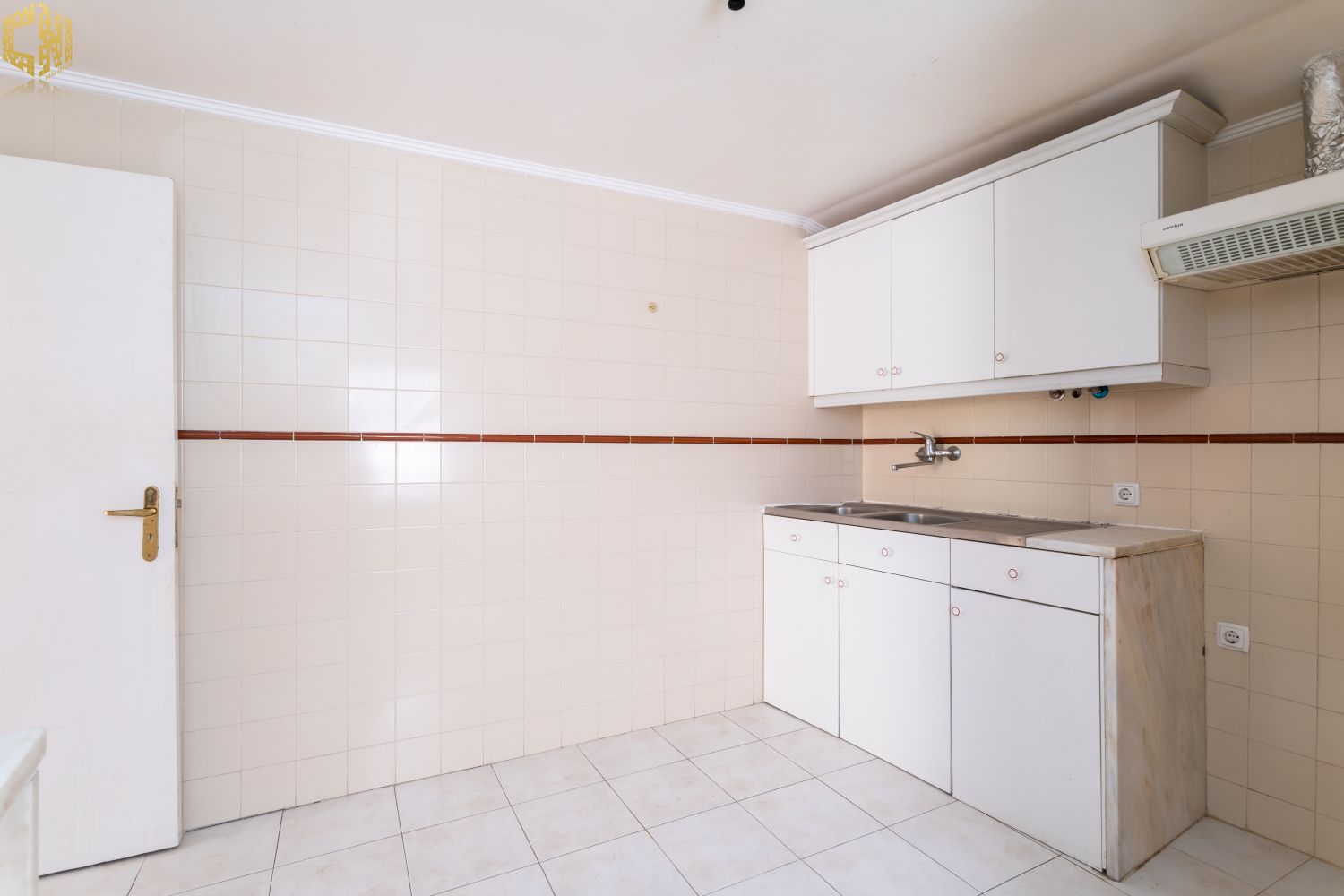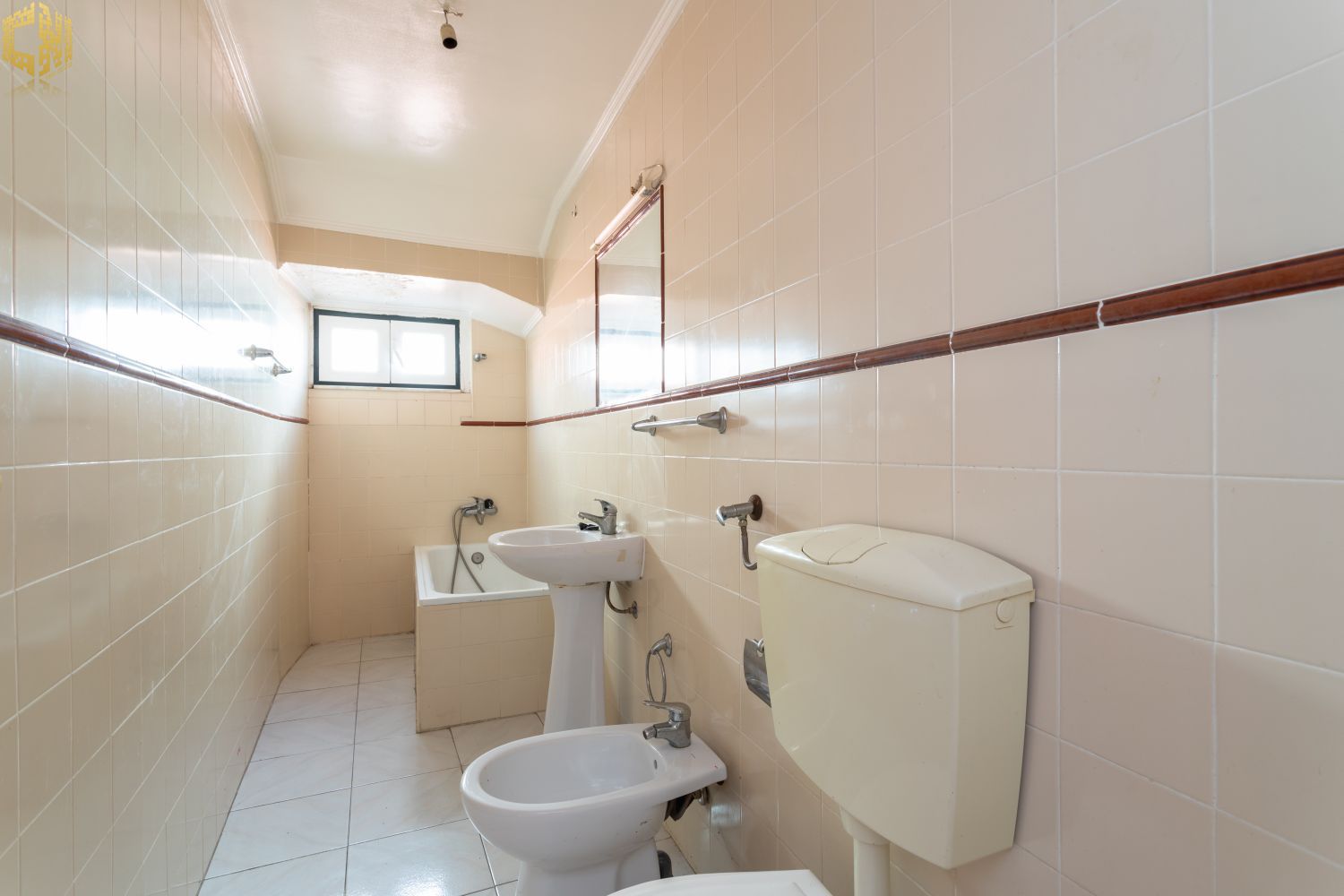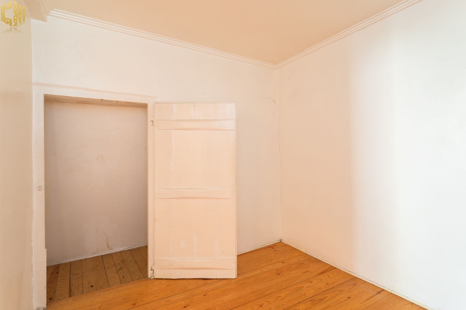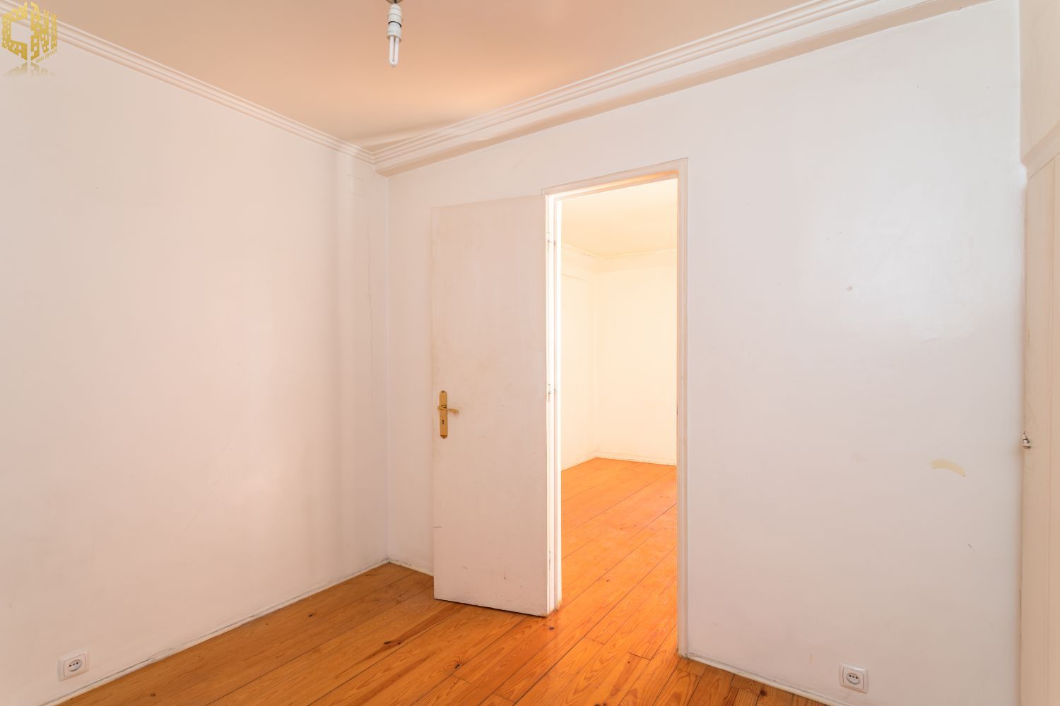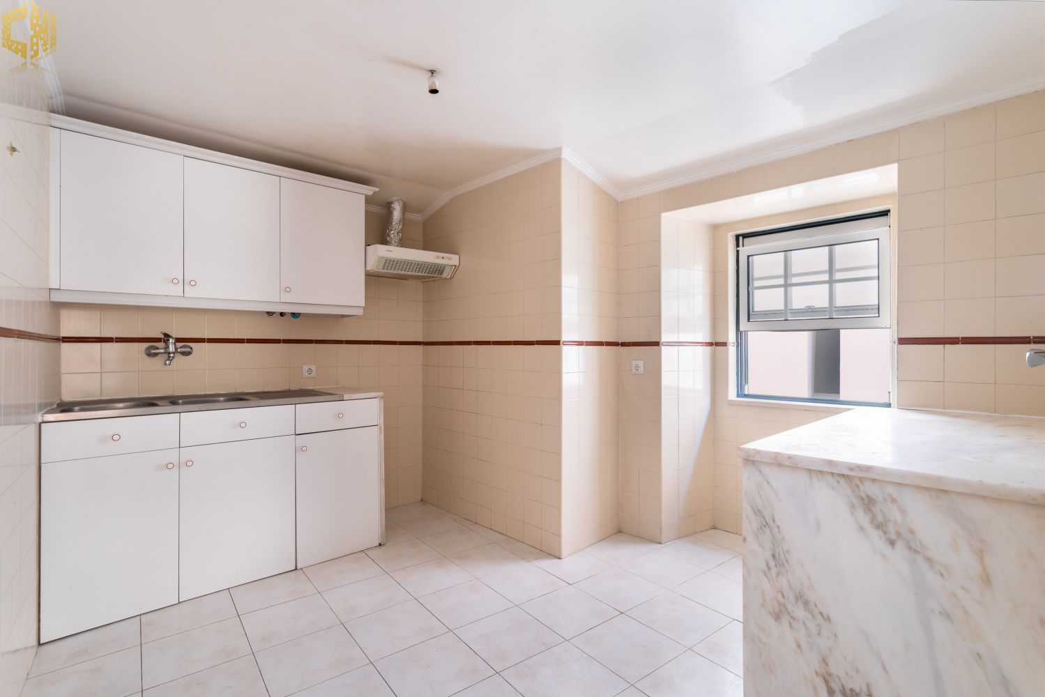 No piso térreo  sala com chão de madeira, dois quartos – um dos quais interior – cozinha, e casa de banho com janela.