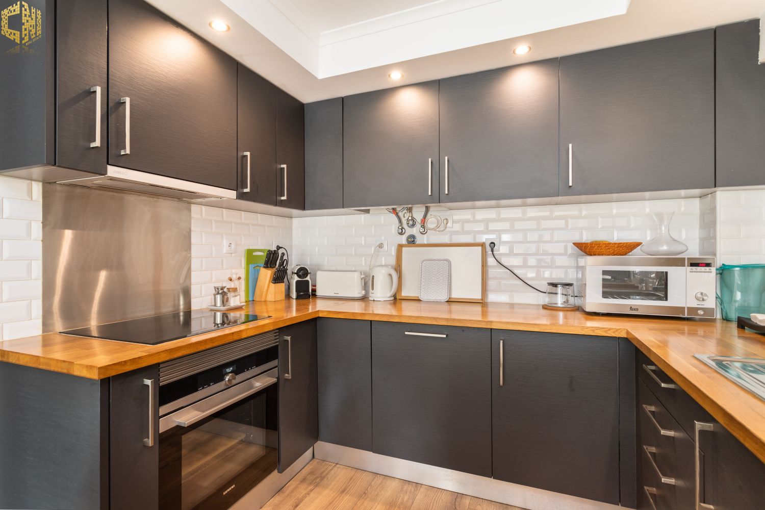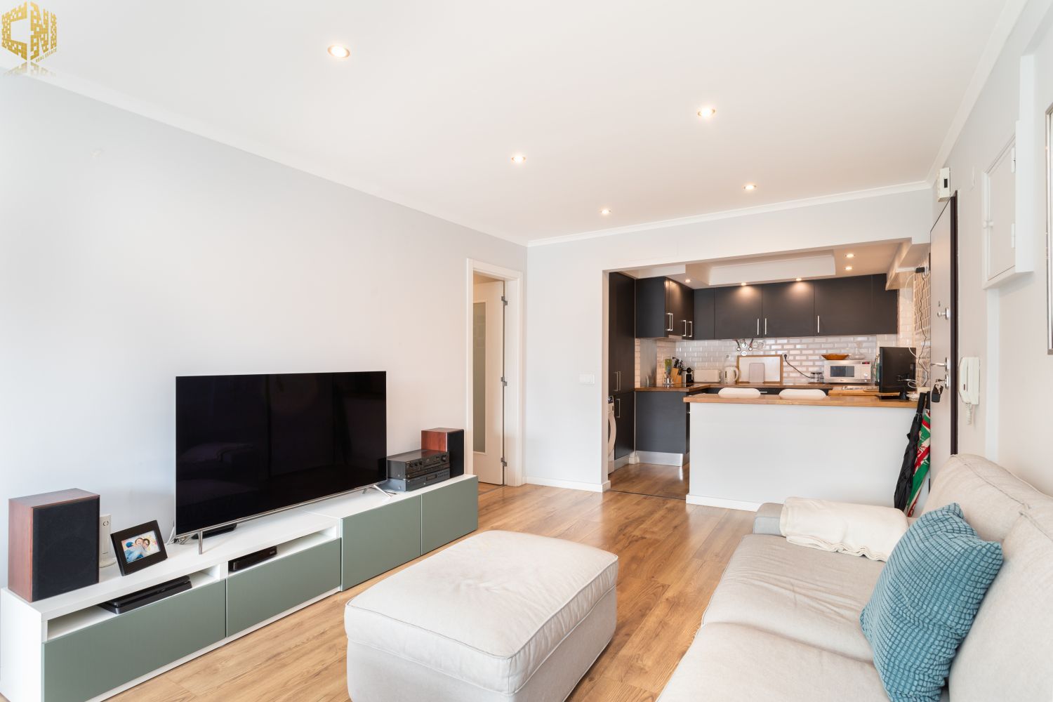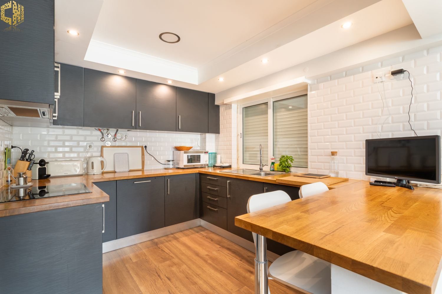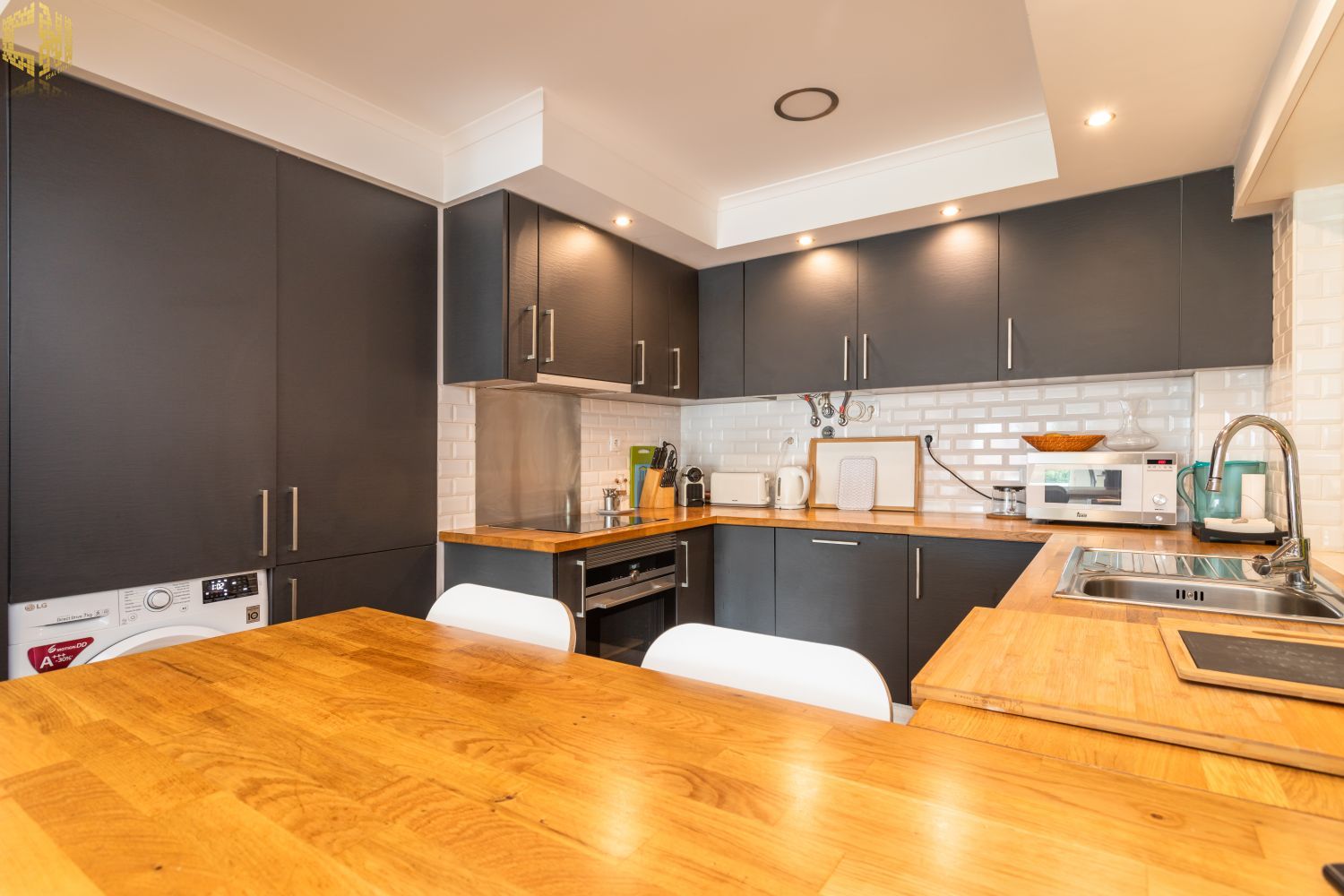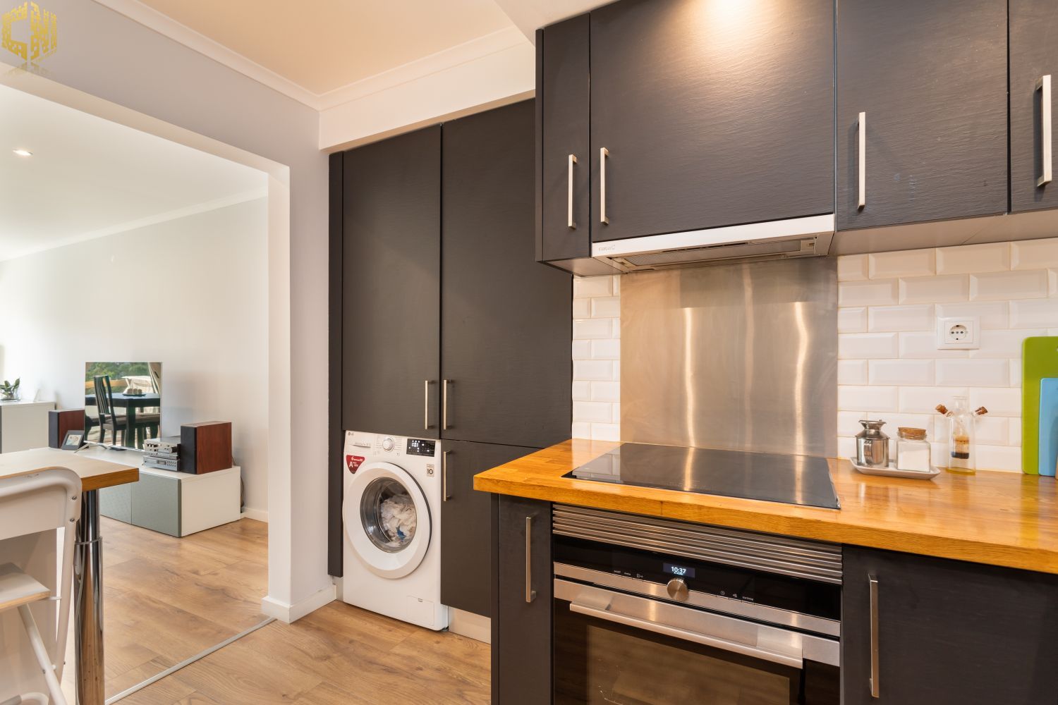 Cozinha americana equipada com máquina de lavar roupa e loiça, frigorifico, placa e forno elétrico, esquentador