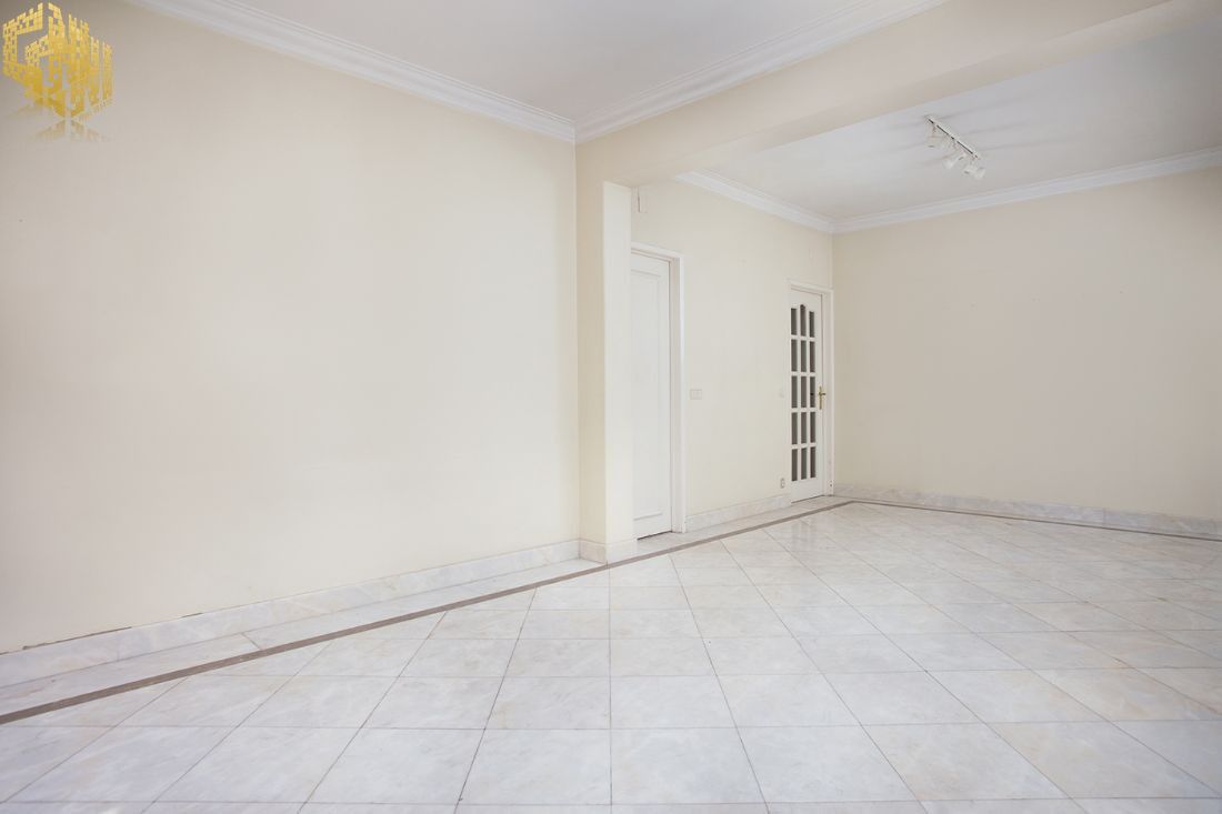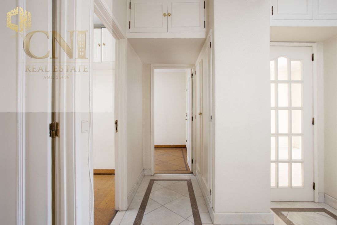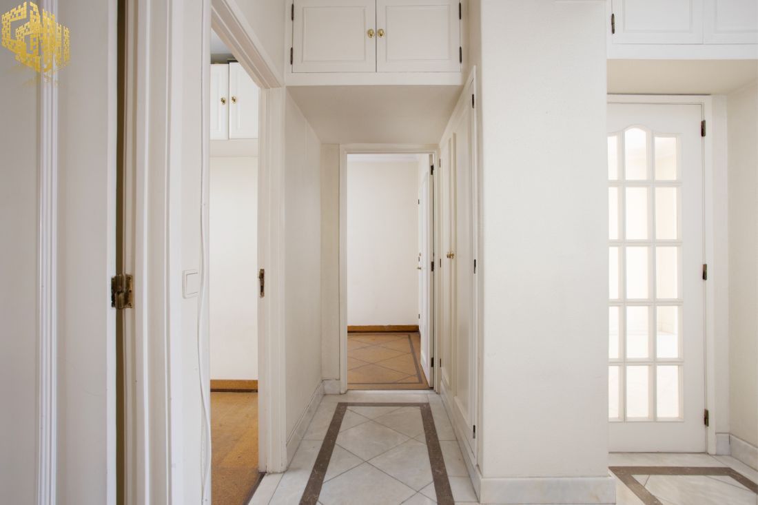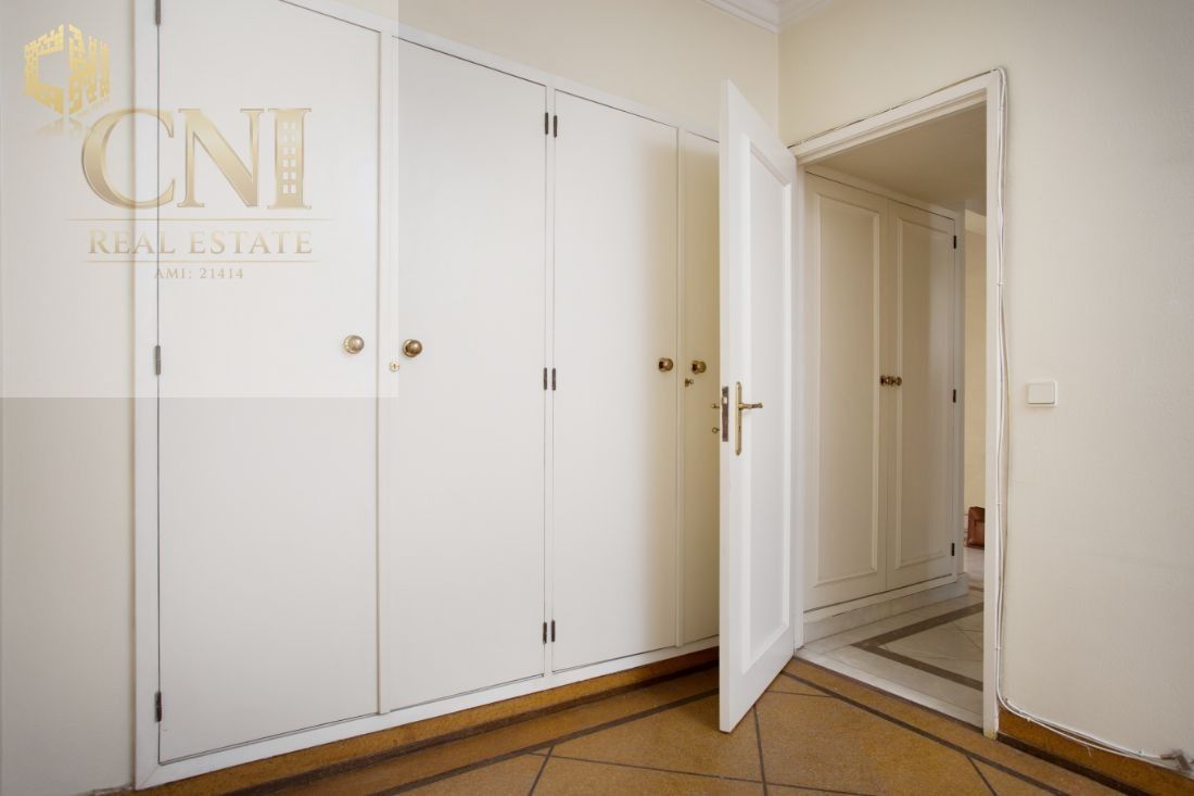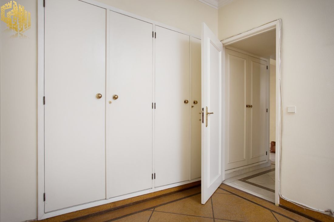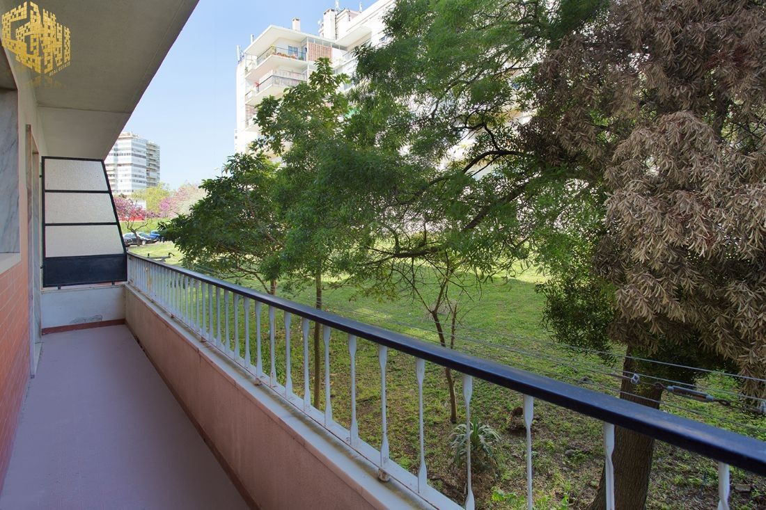 O imóvel fica no 5º andar e as divisões distribuem-se do seguinte modo: a cozinha (incluindo uma casa de banho ou zona de lavandaria e mais uma arrecadação) e a sala encontram-se na frente virada a sul, dispondo de varanda comum e apresentado janelas rasgadas;  os 3 quartos, que partilham uma varanda comum e apresentam igualmente janelas grandes, situam-se na frente virada a norte e com vista para o jardim; na zona central, encontram-se uma casa de banho completa e os corredores de acesso, com armários.                                                                O prédio dispõe de 2 elevadores.